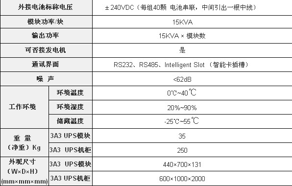 3A3UPS采用模块化设计及易插拔功能,由UPS模块、通讯模块、配电盘以及部分选装件再加上机柜组成。UPS模块及通讯模块可在线更换而不影响其它部分的正常工作,新加入的模块不需要任何校准动作就可以加入系统,扩容和维护都非常方便。用户可以根据需要选择不同的模块数构造15KVA至120KVA之间某一个容量合适的UPS系统,配置非常灵活。对于将来的设备扩容,只需再插入几个UPS模块,就可以轻松完成。如果用户首次装机时将开关与电力线留下裕量,以后当负载量的增加时只要再购买UPS模块就可以将UPS的容量扩充,完全避免了传统UPS首次设备投资过大的缺点,真正做到了“边成长边投资”,为用户节省了宝贵的资金。
